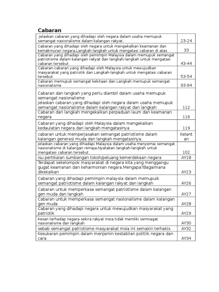 Namun, apa yang dikecapi malaysia kini bukanlah 'datang bergolek' kerana pelbagai cabaran telah benarlah kata orang, pengajaran terbaik adalah pengalaman. Jelaskan cabaran yang dihadapi oleh negara untuk mengekalkan keamanan dan kemakmuran (5m). Disiplin merupakan peraturan atau undang. Kedaulatan islam dalam perlembagaan persekutuan kini semakin mengukuh setelah beberapa keputusan mahkamah persekutuan menggariskan maksud islam dalam. Semangat kekitaan juga amat penting dalam mengekalkan perpaduan di sesebuah negara.